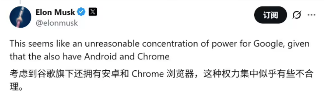 【环球网科技综合报道】1月13日消息,埃隆・马斯克(elon musk)近日在社交平台发文称,考虑到谷歌已经掌控了 android 操作系统和 chrome 浏览器,此次联手苹果是“不合理的权力集中”。